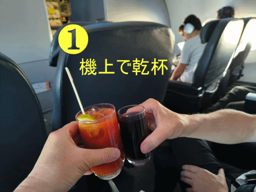 飛行機に乗り込むと、周りはちょうど黄昏時。きれいなANAのアテンダントさんが出発前のシャンパンをふるまってくれたので、それをいただき、旅の終わりを乾杯しました。