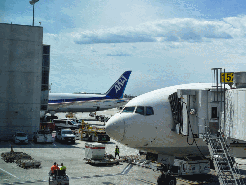 たっぷり散歩を楽しんでホテルに戻ったら荷造りをしてチェックアウト。そのまま空港のターミナルへ歩いて移動し、チェックインを済ませます。そう、この日のフライトこそが今回の旅行のメイン、日本行きなのであります。利用するのはANA。もちろんANAさんは、サンフランシスコからも日本へは成田と羽田の2本の直行便は出ているのですが…。