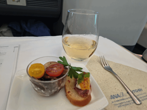 これに着替えると本当に楽なのですよね。ちなみにANAさんのパジャマは返却が必要ですが、ユナイテッド航空やルフトハンザ航空ではお持ち帰りOKだそうです。安定飛行に入って夕食のサービスが始まりました。まずはアミューズとドリンク。僕はシャンパン、Dさんは白ワインを注文しました。今回の旅行ではいろんな人と何度も乾杯を交わしましたが、これが最後の乾杯ですね。