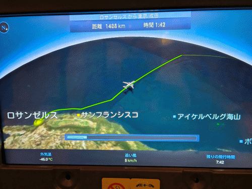 食事の後は映画でも観ようかと思ったのですが、観たいと思える作品がありませんでした。もともと映画やテレビはあまり観ないのですが、飛行機では数本は観るのに、今回はすっかり興味を失ってしまったようです。そのままベッドをフルフラットにして就寝。行きの便では1時間ほどしか眠れなかったのに、帰りはぐっすり熟睡してしまいました。