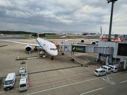 成田空港に到着してラウンジでのんびりした後、ゲートに向かいました。ちなみに一応ラウンジのシャワーの順番待ちを入れておいたのですが、結局あと7人ほどの手前で断念しなくてはいけない状態でした。ここのところ、成田にしても羽田にしても、このANAのラウンジでは待ちの人が多すぎてほぼ100%の割合でシャワーを使えない状態ですから、ANAさん、これは少し改善対策をした方がいいかもしれませんね。