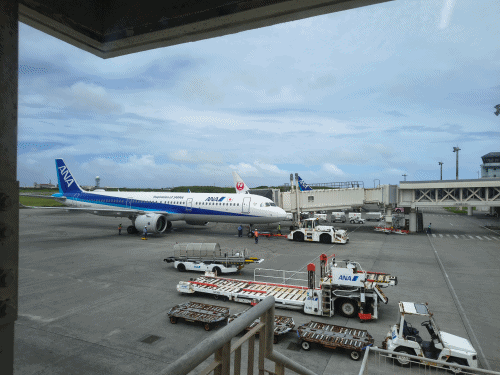飛行機は定刻通りに出発!今回の旅で沖縄行きを含め6本のフライトがありましたが、すべてANAを利用し、そしてすべてが定刻通りの出発でした。これはさすがだな~と感心します。もしこれが我らがユナイテッド航空だったら、こうはいかなかっただろうな~とDさんと話していました。飛行機が安定飛行に入ると、僕たちは早速ANAさんからパジャマを借りて着替えました。