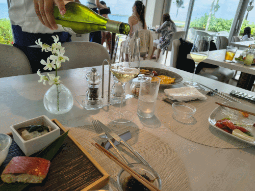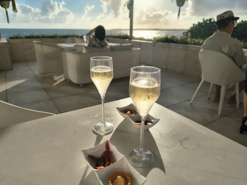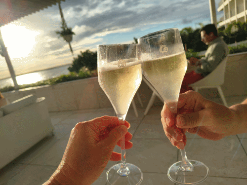 Dさんはそのまま昼寝、僕は写真の整理やブログ執筆をしてのんびり。せっかくのいいホテルですから、こういう時間の過ごし方も贅沢ですよね。気づけば夕方、そろそろ5時。ホテルでのシャンパン無料飲み放題「Happy Hour」の時間です。この日も結婚式のゲストが大勢訪れており、特に女性たちは華やかに着飾っていて目を引きました。