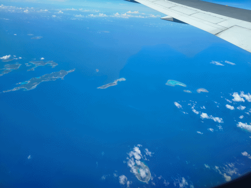 宮古島から羽田まではおよそ2時間半のフライトです。沖縄諸島や奄美諸島の上を飛ぶので、機上からいくつもの島々を見ることができます。たくさんの島がサンゴ礁に囲まれ、海の青さが一段と際立っていて、眺めているだけで得した気分になれるほどでした。国内線としては1、2を争う長距離フライトでしたが、飲み物の提供以外は特にサービスなし。エコノミーってそんなものなのかな?