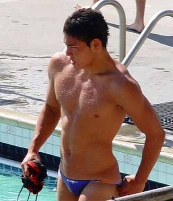青いシャツにぴちぴちの下着かも? と思わせるような赤いパンツが印象的です