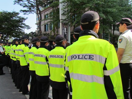 黄色いジャケットを着た警官が 韓国国旗を持ち