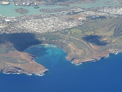 空港から飛び立った飛行機はまっすぐにワイキキ方面をとびハナウマベイへ