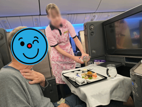これに着替えると本当に楽なのですよね。ちなみにANAさんのパジャマは返却が必要ですが、ユナイテッド航空やルフトハンザ航空ではお持ち帰りOKだそうです。安定飛行に入って夕食のサービスが始まりました。まずはアミューズとドリンク。僕はシャンパン、Dさんは白ワインを注文しました。今回の旅行ではいろんな人と何度も乾杯を交わしましたが、これが最後の乾杯ですね。