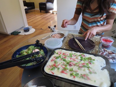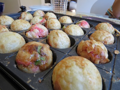 Scotts Valleyで皆に作るときはタコでなくてソーセージ、ズッキーニ、パプリカにチーズなどで彩りよく焼くと喜ばれます。トマトサルサの様なソースもつくったりしますが、日本のたこ焼きソースが一番人気です^^;