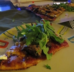 >今夜のピザもおいしそう!ルッコラの葉っぱがいいですね〜。長い間、手作りピザに憧れてるんですが、まだ実現できていません。この週末は思い切って作ってみるかな♪外で頼んだら。。。ピザ+ビールで$30以上でしょう。(^m^)