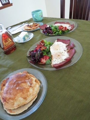 この日の朝食は例のごとくパンケーキとハムエッグ
