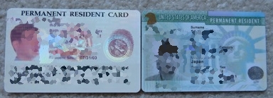 >私のグリーンカードはまだクリーム色のやつです。。でも、写真は前向きです。10年ものを3年位前に更新しました。新しいデザインになったんですね~!