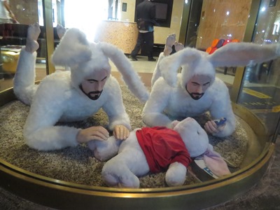 髭面のうさぎの着ぐるみを着た男性マネキンが2人 元回転ドアだった入り口に飾ってありました