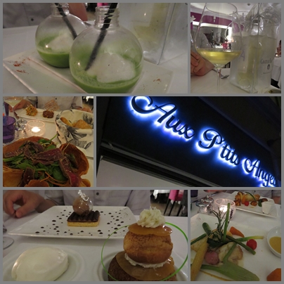 右上:白ワインで乾杯 左上:豆のビシソワーズ ストローで飲みます