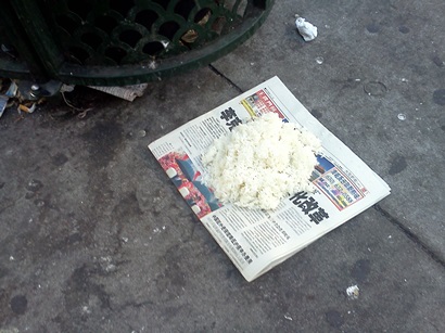 未公認業者の並ぶ延長上に置いてあった新聞紙を広げてその上にあったごはん