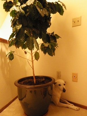 真っ暗な場所のコーヒーの木の裏に隠れていました!