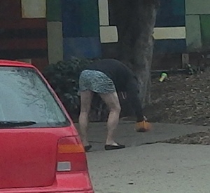 一心不乱にデッキブラシの頭のブラシ部分を使って道の掃除をしていました