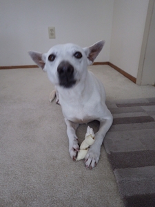じっと犬用スナックを見つめ 本当にいいのだろうか?と思っているようなCocoには
