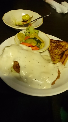 知ったかぶりでごめんなさい。僕も食べたこと無いのですが、聞いた話ではフライドチキン用の衣でステーキを揚げるそうです。よってChicken Fried Stakeだって。Dさんスリムなのに凄い!僕は見るだけで体重増えそう。。。