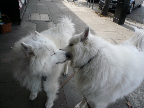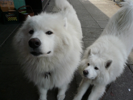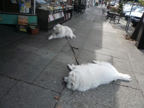 古本屋の前で たぶんご主人を待っているんでしょう~ 2匹は繋がれているけど