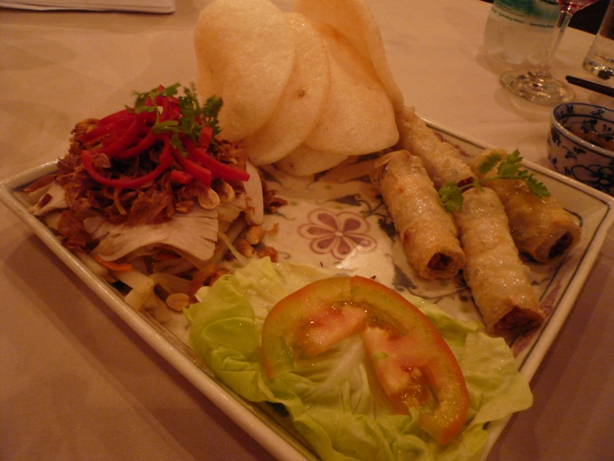 お皿 左が蓮の茎を使ったベトナムサラダ となりのせんべいの上にのせて食べるそうです