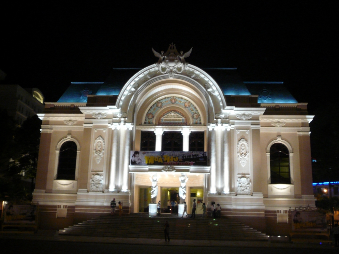 ライトアップされた コロニアル建築を眺めながら 夜の街を 散歩