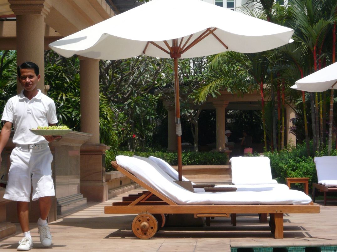 プールに行くと まずアテンダントが デッキチェアーにタオルをひいてくれます