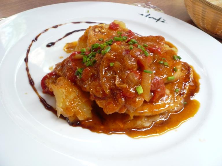 イベリコ豚のソテー トマトソースがけ 下にはポテトが入っています