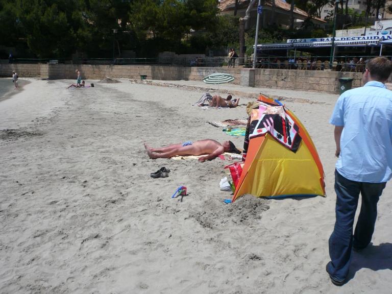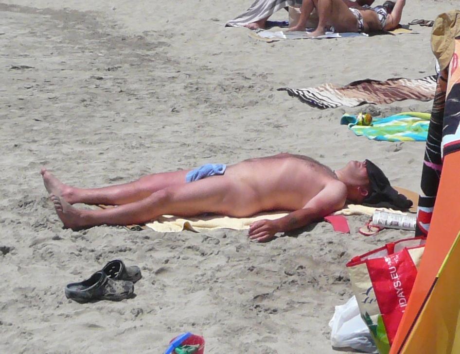 日焼けオジサマの局部を隠してるタオル、なかなかユニークな形に折ってありますなぁ。