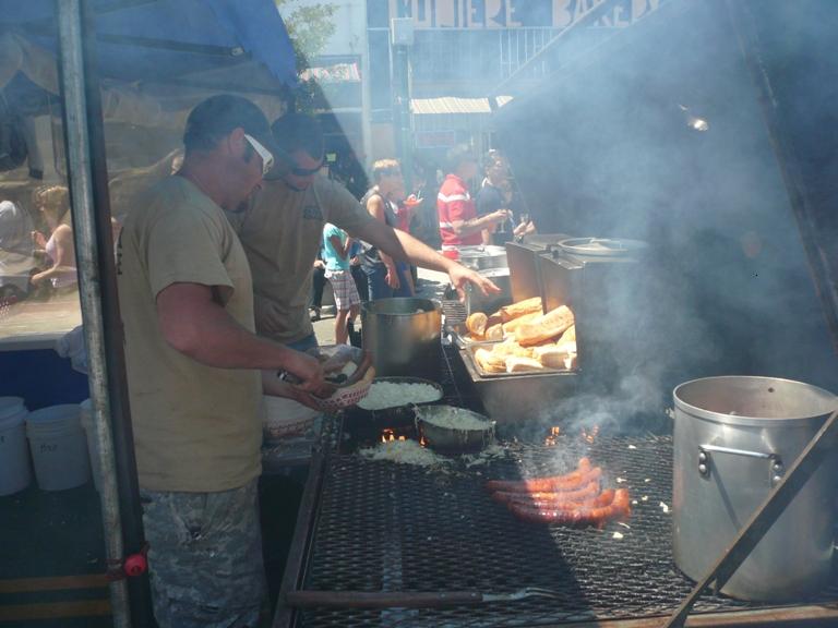 煙に巻かれたおにいさんたちが 一生懸命大きな大きな ソーセージを焼いているじゃないですか~!