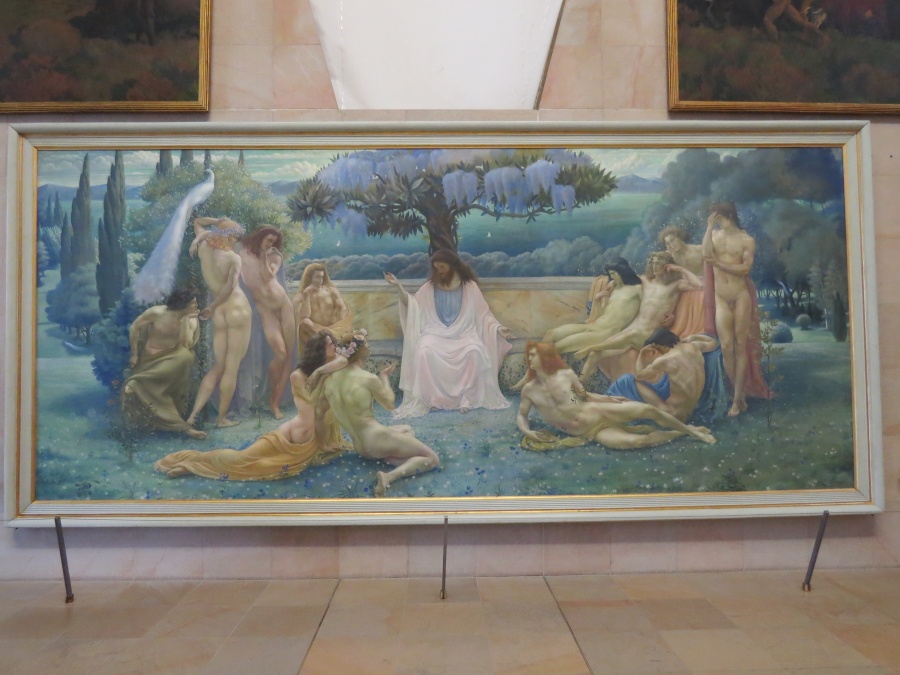 そんな状況下で、僕が気になった作品はこちらでした。イエスキリストが中央に座っているごくありふれた宗教画的な絵に見えるものなのですが、よ~く見てみると周りにいるのはすべて男性で女性が一人もいません。その上、皆さんほぼ裸で悩ましい格好でぴったりと肌を合わせているのです。Dさんにそれを告げたら、Dさんもこれってかなり意味深な絵画だよね~と興味津々でした。