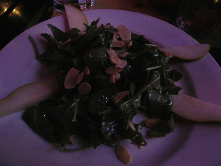 最初は 梨とアルギュラのサラダ ロースとアーモンドのせ