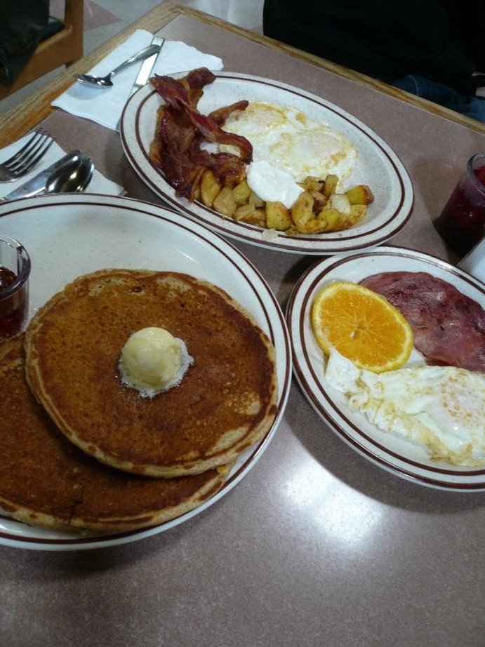 僕はパンケーキ(ホットケーキ)セット Dさんはベーコン&目玉焼きです久しぶりにこういうのを外で食べましたけど なかなかいいものです!