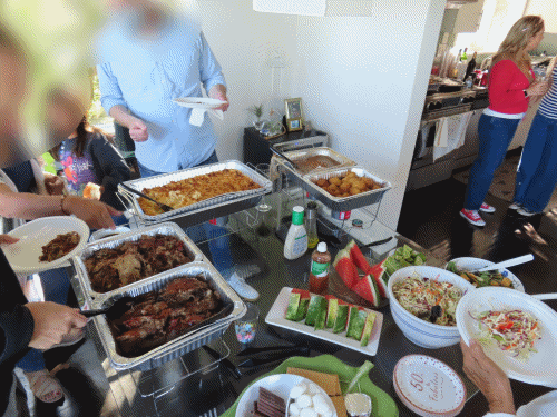 一応うまくいったようなので、パーティが始まりました。用意されたのはアメリカンなBBQやマカロニチーズ、野菜サラダというこちらではごくごく頻繁に見かけることができるパーティー料理です。ビーフ、ポーク、チキンの3種類の選択肢があるのがいいですね!子供も参加のパーティーですからBBQソースは甘いものとスパイシーなものが別に用意されていていました。
