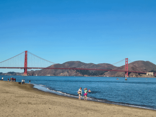 そう、サンフランシスコは常に霧が多く、この場所に来ても視界が霧のため白く覆われていることの方が圧倒的に多いのです。だからこそ、こうしてクリアな景色を眺められるのはとても貴重なこと。記念撮影をした後は広大な砂浜が続くオーシャンビーチへ向かいました。この日は天気が良く、今まで見たこともないほど多くのサーファーたちが波に乗っており、目の保養にもなりました(笑)。
