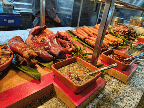 ビュッフェは人気で並ぶと聞いていたものの、僕が到着した時間は幸い、まったく行列がなく一安心。席に案内され、いよいよ食べ放題スタートです。まず全体を見渡すと、カニ・エビ・ロブスター・ホタテ・カキといったシーフード、プライムリブなどの肉料理、メキシカン、寿司、フィリピン料理、ピザ、パスタ、中華と、ほぼ「なんでもあり」の充実ぶり。