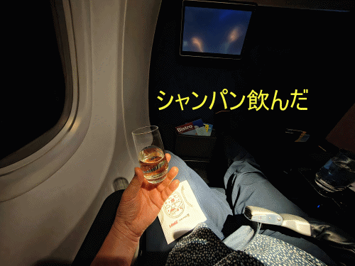 ようやくゲートが開き、機内へ。僕のセクションを担当していたのは、大柄で少し意地悪そうな雰囲気の40代のゲイ黒人男性アテンダント。嫌な予感しかしませんでしたが、着席後には一応ウェルカムシャンパンをサーブしてくれたので、最低限の仕事はするつもりのようです。