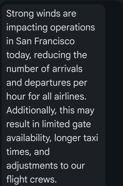 無事ゲートに到着して一息つくとユナイテッド航空から「サンフランシスコの悪天候により着陸回数が制限され、この便は遅延します」とのメッセージが……。オイオイ、なぜもっと早く言ってくれないのか。急ぐ必要は全然なかったじゃないか、と肩の力が抜けました。とはいえ、これも我らがユナイテッド航空の“いつものパターン”です。
