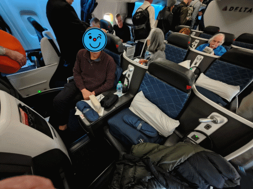 さて、いつもより少し心地よいラウンジで過ごした後、すでに搭乗開始時刻となっていたためゲートへ向かいました。デルタ便は遅延もなく予定通りの出発とのこと。これは素晴らしいですね。ゲートに到着すると、すでに多くの乗客が乗り込んでおり、僕たちも座席へ向かいました。