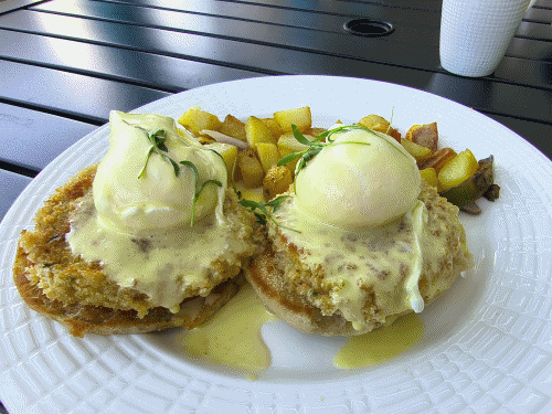 プールテラスを望む席に陣取り、Dさんはアボカドトースト、僕は蟹肉のエッグベネディクトを注文しました。これが予想を遥かに超える美味しさで、良い意味で期待を裏切られました。「明日もまたここで食べたい」と思わせてくれるクオリティでした。