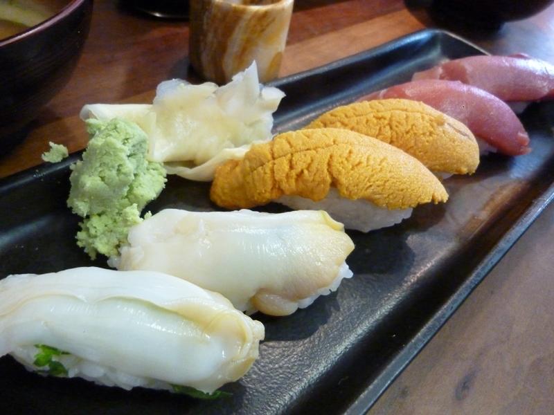 左からツブ貝 うにの握り 本マグロ