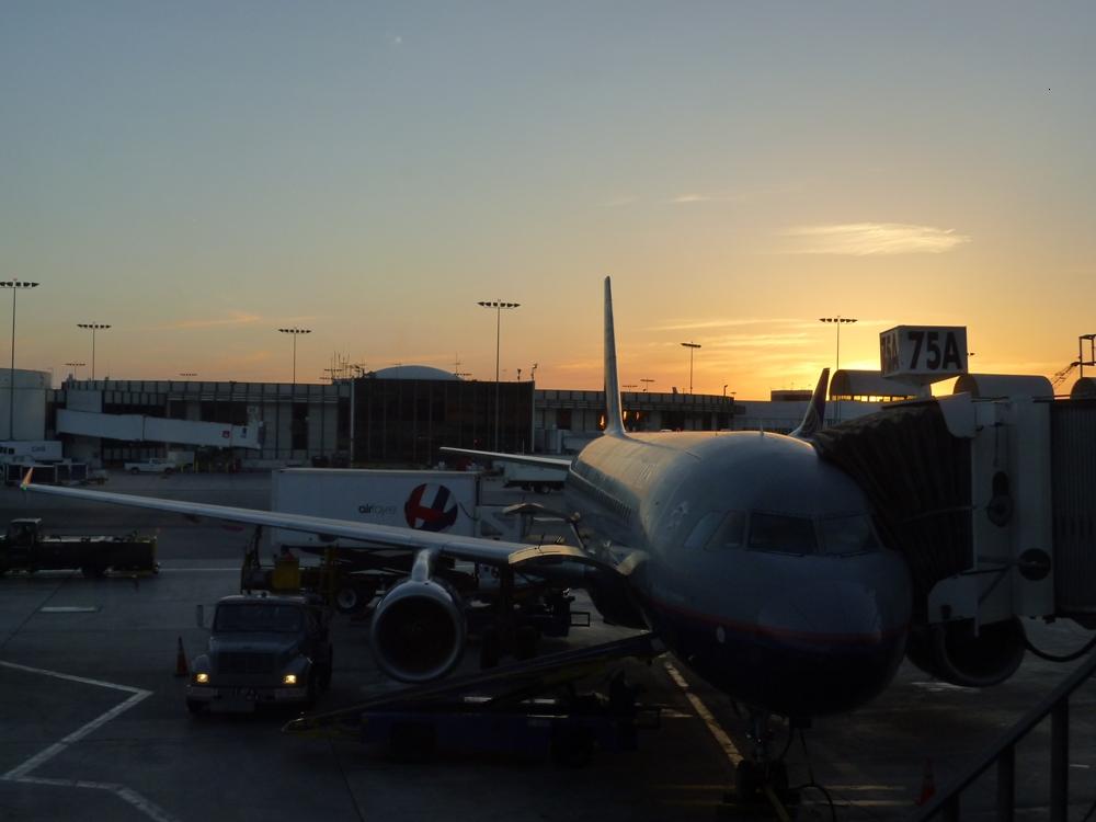 あれほど明るかった太陽も西に沈みかかり 夕焼けが見えてきました 時間的にはこの前の飛行機にも間に合うくらいの時間に空港についていたのですが