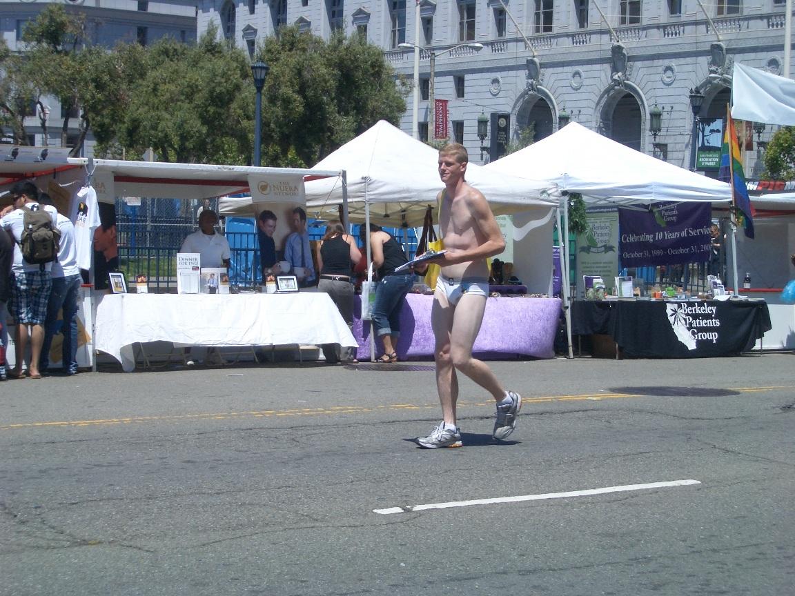 ブリーフ一枚で歩き回っていて この奇抜な格好に近寄ってくる人たちにアンケート調査?
