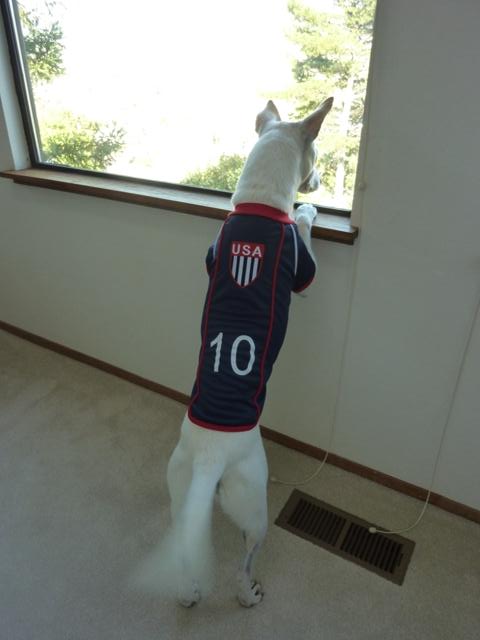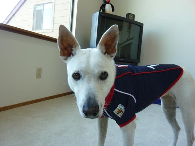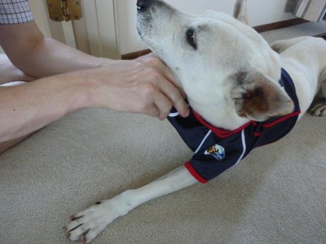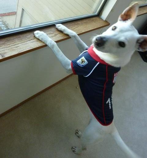いつもはフワフワの体の毛皮が 小さめのサッカーユニフォームで押さえつけられてしまい