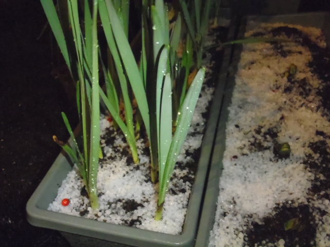 しっかり育ってきたイギリスからの水仙の上にも降り注いでいました