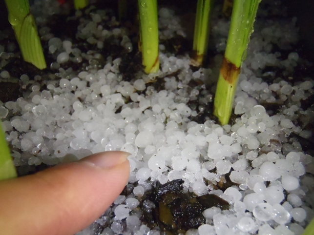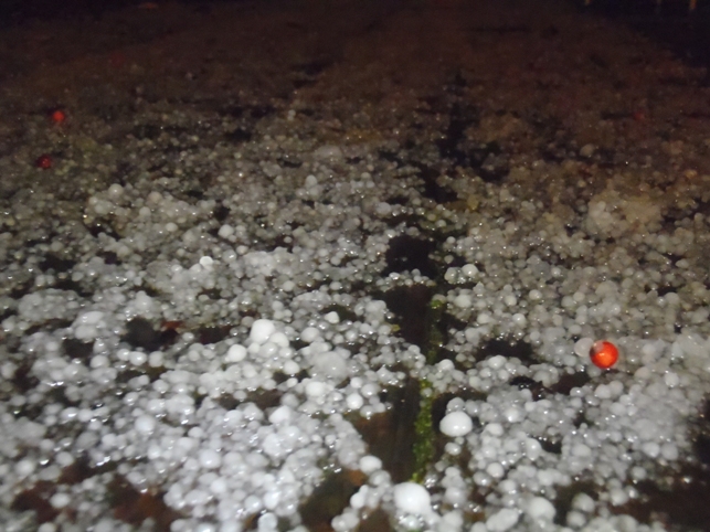 私は雹が降り出したとき、長女の水泳の試合でプールぎわのテントの下でタイマーをやっていたのですが、ものすごい音がしだしたので何かと思ったら、雹でした。。一旦水泳の試合が中断しました。。1cm位ありました!!5mm位なのは見た事があったけど、こんなに大きなのは初めてだったかも~。。びっくりしました。。Livermoreです。帰って来たら、うちのほうでは降ってなかったみたいでした。。夫が気が付かなかっただけかな。