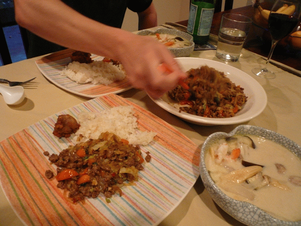 ひき肉 にんにく 玉葱 人参 白菜 春雨を 豆板醤 赤味噌で炒めたもの