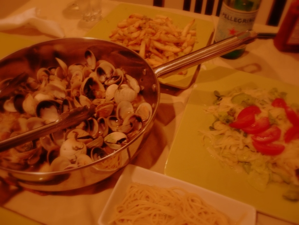 貝のワイン蒸し 野菜サラダ ガーリックポテトフライにしてみました