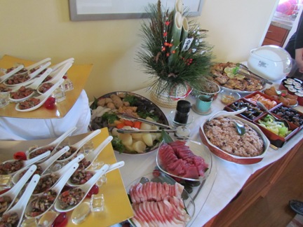普通の日本人よりもずっと立派なお節料理の数々 上左:黒豆 海老 漬物 昆布巻き 上右:2世サラダ 寒天 豆腐バーグ