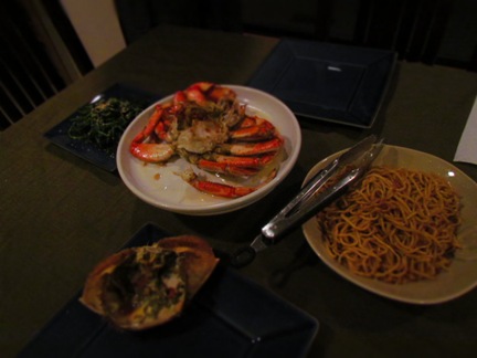 >蒸したダンジョネスクラブを大蒜たっぷりのソースで炒めたものに やはり大蒜たっぷりの平麺 の組み合わせで食べました。